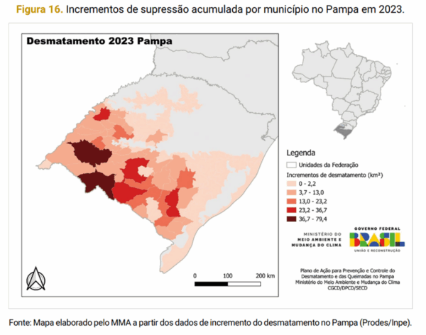 Mapa e trecho do Plano de Ação para Prevenção e Controle do Desmatamento e Queimadas do Pampa – PPPampa 2025-2027 (MMA). Pág. 53 e 54.