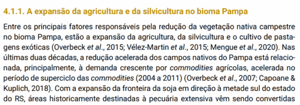 Conforme o Plano de Ação para Prevenção e Controle do Desmatamento e Queimadas do Pampa – PPPampa 2025-2027 (MMA) o agronegócio de grãos, silvicultura e pastagens cultivadas já ocupam 45% da área do bioma, superando a área de vegetação nativa remanescente. O avanço da silvicultura tem contribuído com este cenário, e por meio do RS+Renda e da implantação do Projeto Natureza, certamente agravará o arco da supressão da vegetação nativa, que avança rapidamente para o sul e oeste do estado, comprometendo o pouco que resta deste bioma único. Também afrontam as diretrizes do Plano PPPampa, que já está sendo implementado, sob coordenação do MMA.